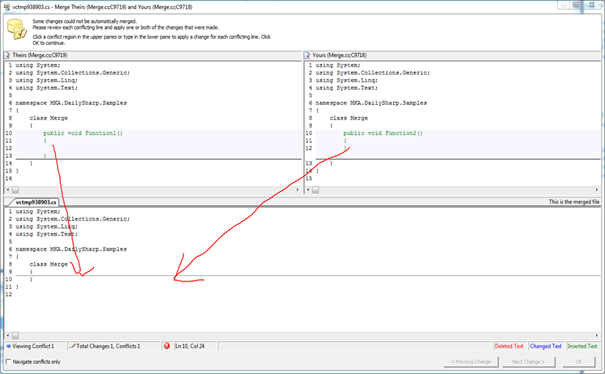 Immer wieder sehe ich, dass Entwickler Probleme mit dem Mergen von Code im Repository haben. Das Mergen ist aber kein mystischer Vorgang, bei dem uns der TFS unseren Code zerstört. Das Mergen ist einfach nur das Zusammenführen von Änderungen mehrerer Personen an denselben Dateien. Wenn z.B. zwei Entwickler einer Klasse je eine Funktion hinzufügen, dann meldet der TFS einen Konflikt.