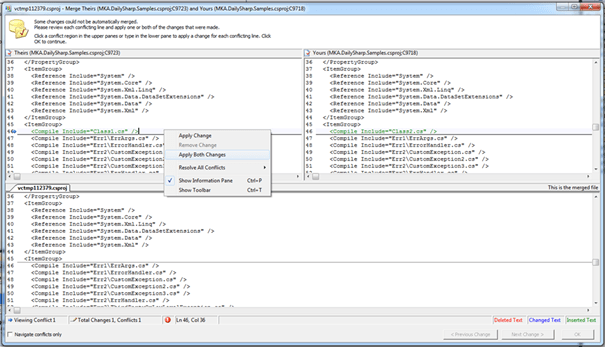 Probleme beim Mergen werden oft durch veränderte Projektdateien (.csproj) verursacht. Dabei verhalten sich diese Dateien genau wie anderen auch. Im Beispielprojekt wurde von 2 Entwicklern je eine Datei hinzugefügt: