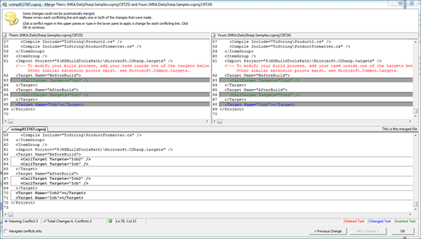 Eine sehr komfortable Version ist der AutoMerge. Wenn dieser aktiviert ist, dann kann sie problemlos benutzen werden. Wenn der TFS Änderungen nicht automatisch zusammenführen kann, dann ist die Funktion deaktiviert und der Merge muss von Hand durchgeführt werden.