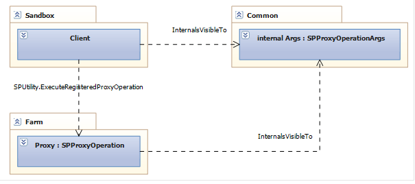 In your projects you don’t want your full trust proxy to be accessible for other solutions. This would be a security issue. To secure your full trust proxy so that it can only be used by your application you have to provision your proxy arguments in a separate (common) assembly and mark the argument type with the internal modifier. To use these arguments in the farm- and sandboxed solutions you have to add the InternalsVisibleToAttribute to the common assembly. The attribute is added to the Properties.cs like this: