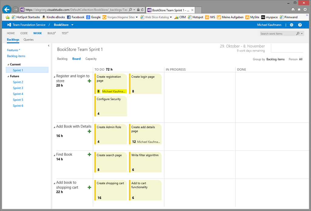 Um das Feature zu zeigen muss man sich erst mal WorkItems zuordnen. Dies geschieht am einfachsten über das Taskboard indem man direkt die Kachel editiert oder mit Personenfilter die Aufgaben zu der Person zieht.