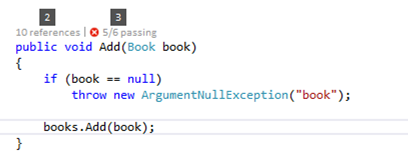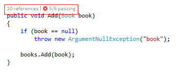 Code Lens fällt einem Sofort auf, wenn man die erste Solution in VS 2013 öffnet. Über einer Klassen- oder Methodendefinition steht in einem hellen Grau die Anzahl der Referenzen. Wenn man dann für die Methode noch ein paar Tests geschrieben hat, werden neben den Referenzen noch die Testergebnisse für die Methode angezeigt.