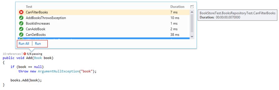 Der Indikator für Test öffnet eine Liste mit allen Tests, die diese Methode Testen. Über einen Doppelklick kann man zur Testdefinition springen. Man kann Tests einzeln oder alle zusammen direkt von hier aus ausführen.