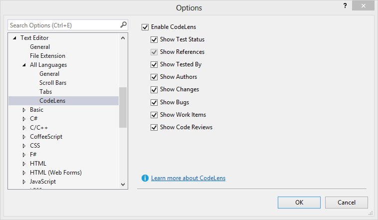 Damit Code Lens funktioniert muss auf dem TFS Server (natürlich 2013) die Code-Indizierung aktiviert sein. Außerdem ist es nur mit der Ultimate Lizenz verfügbar. In Visual Studio kann auch noch konfiguriert werden, welche Indikatoren angezeigt werden sollen – standardmäßig sind aber alle aktiviert.