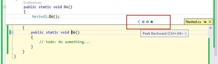 Öffnet man innerhalb des Frames eine neue “Peek Definition”, dann erhält man über dem Fenster eine schöne Breadcrump, über die man schnell und einfach zwischen allen geöffneten Definitionen navigieren kann – und alles ohne die aktuelle Seite zu verlassen!