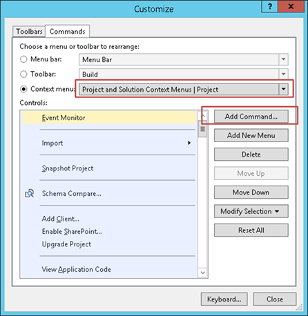 To create a shortcut to the commands in the context menu go to: Tools à Customize à Commands. Select “Project and Solution Context Menus | Project and click “Add Command”