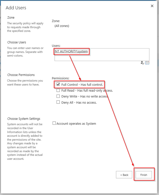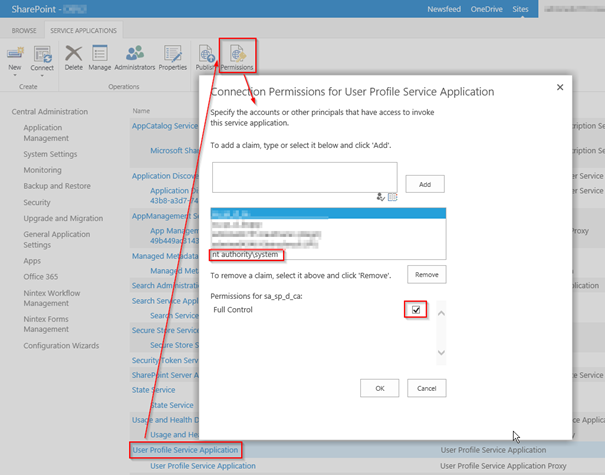 If you want to work with content in site collections (like web or lists) you have to grant permissions therefor too. The easiest way is to create a policy in the web application and grant full access to the local system account. You can do this in central administration in “Application Management” à “Manage web applications”.
