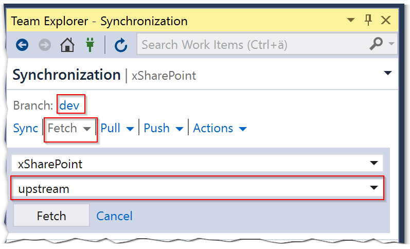 To merge changes to your branch, you find your upstream repository in Team Explorer under Branches and can initiate the merge there.