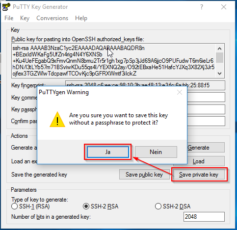 Open puttygen and load id_rsa. Click “Save private key” and confirm the dialog. Save the file in the same directory as id_rsa.ppk.