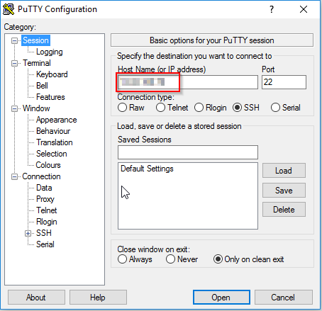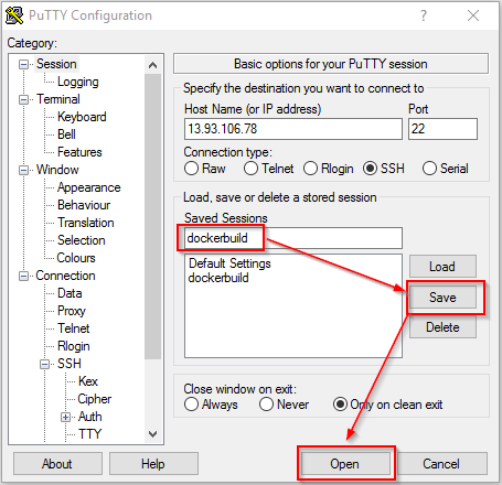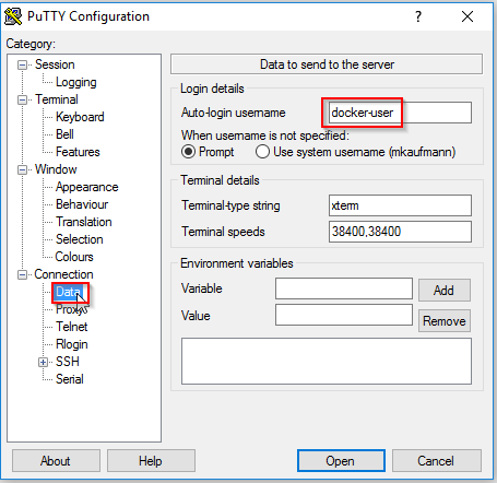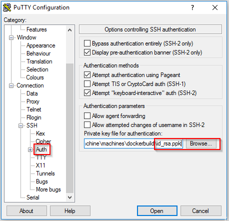 Now you could ssh into your machine with docker-machine ssh {machinename} – but you cannot paste things to the console. So it’s better to create a putty connection. Run