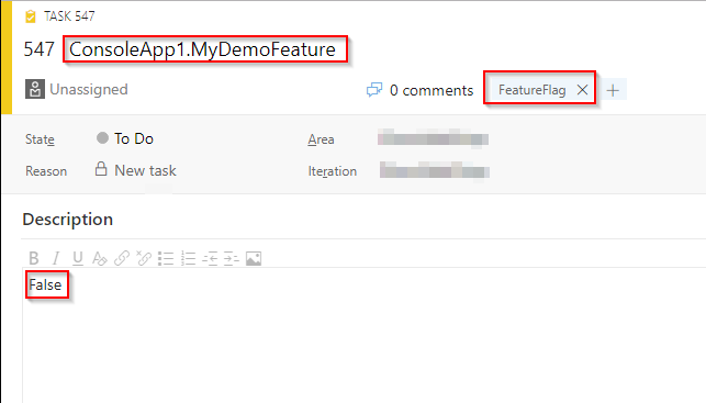 The code will create a WorkItem of the type task by default and add a tag “FeatureFlag”. The title of the task will contain the name of your feature (depending on your naming conventions). The value is stored in the description field. Change the value from “False” to “True” and save the WorkItem. Your feature flag is now turned on.