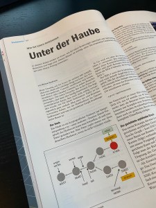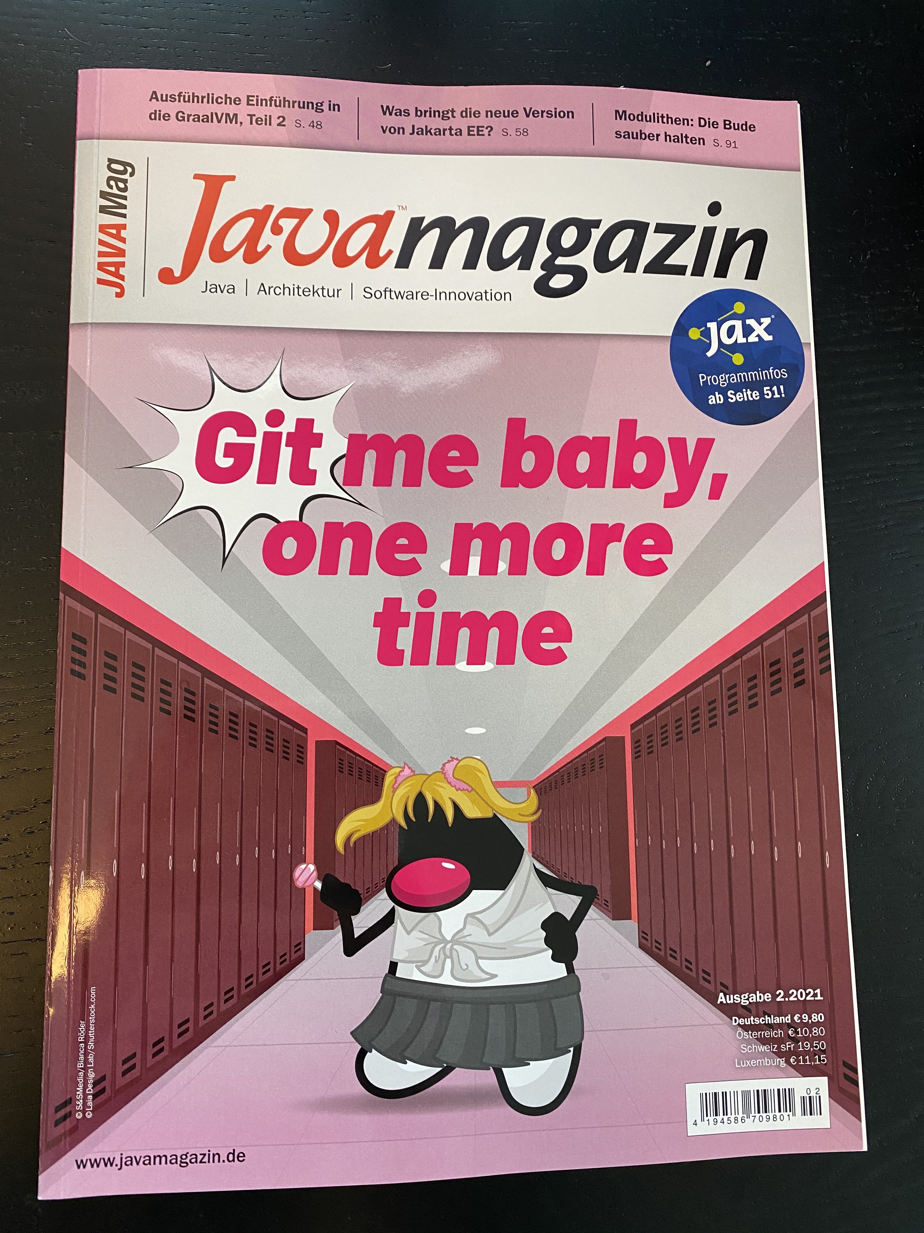 This edition (2.2021) of the Javamagazin (German) contains a special about Git with three articles: Git Basics and Best Practices (Lisa Rosenberg), Pimp my Git (Sandra Parsick) and my article Under the Hood (Unter der Haube).