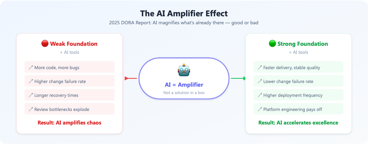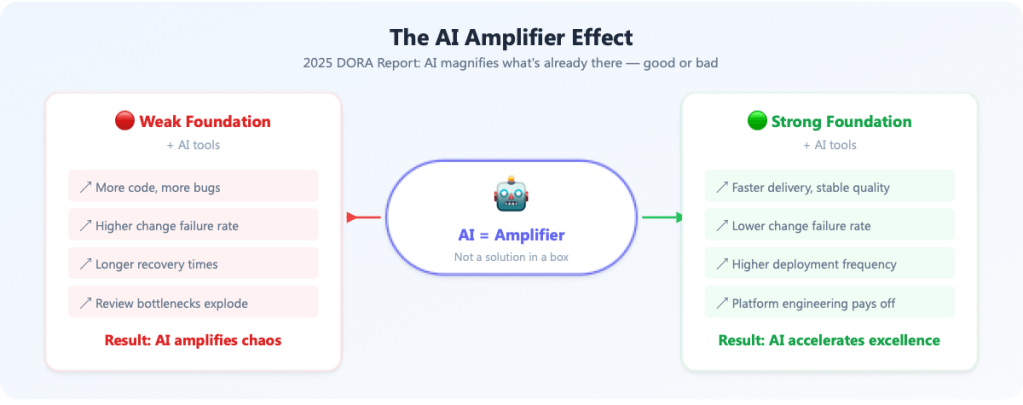 The 2025 DORA report nailed it with one phrase: “AI is an amplifier.” It magnifies whatever’s already there. Strong engineering culture, good architecture, solid CI/CD, clear value streams? AI makes all of that better. Weak foundations, unclear ownership, poor testing discipline, no deployment automation? AI pours gasoline on the fire.