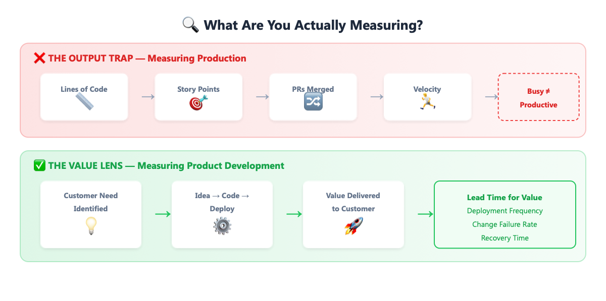 Yet most organizations still measure developers like factory workers: story points completed, lines of code written, PRs merged per sprint, tickets closed. They’re measuring busyness, not value. And now they’re confused when AI makes developers “busier” without making the business better off.